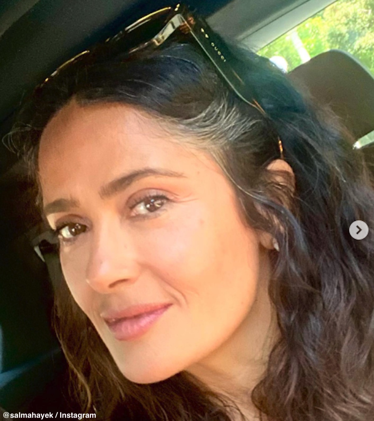 彼女はインスタグラムにて一連の素顔の自撮りを共有し、グッチのサングラスをかけ、こめかみ近くの白髪を披露した。「白髪を染めずに隠すコツがあるの」とサルマは書き、「髪にメガネをかけないで!!! 知恵をもたらせよう」と続けた。