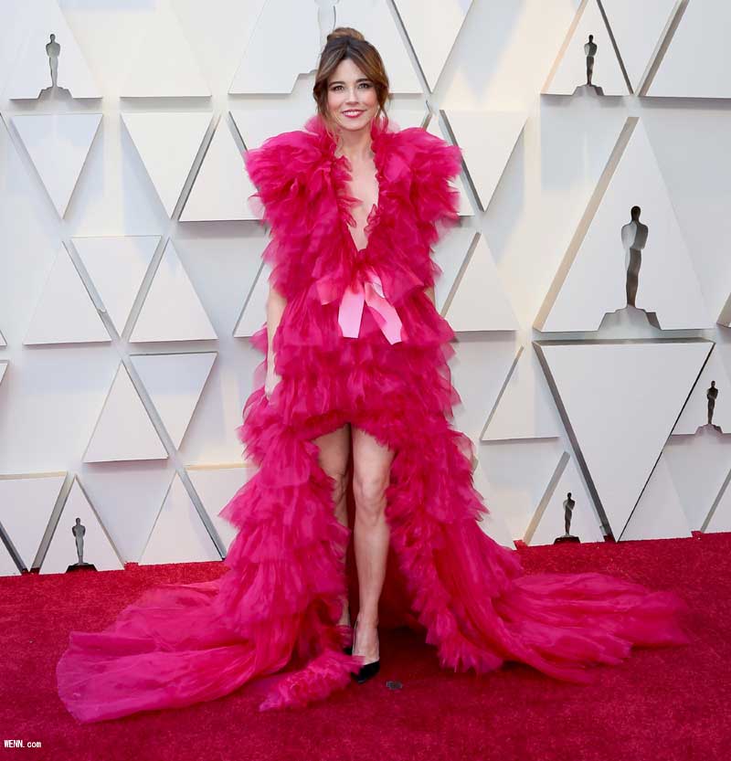 アカデミー賞作品賞を受賞した映画「グリーンブック」出演の女優リンダ・カーデリーニは、ツートーンカラーのドレスで登場。ウェストラインにベイビーピンクのリボンを添え、柔らかさをプラスした。