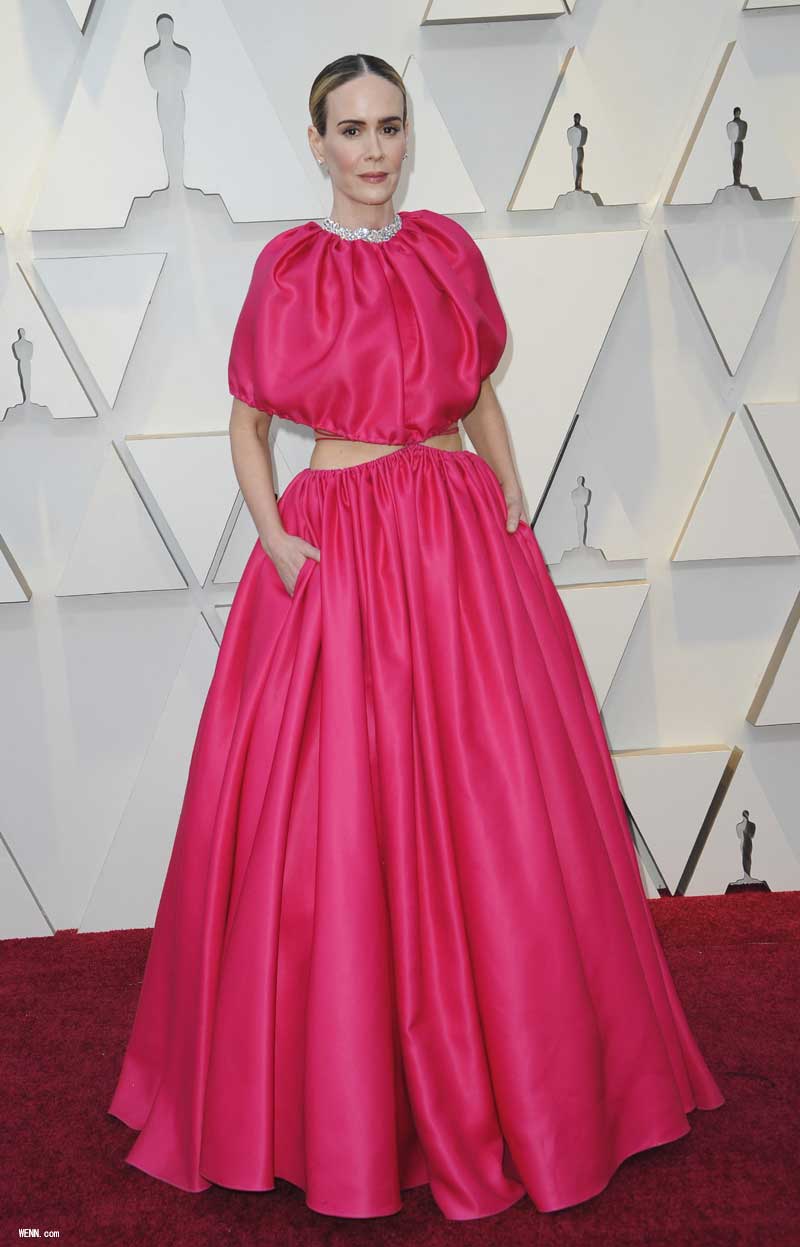 アメリカ人女優のサラ・ポールソンは、ウェストをチラ見せしたセクシーなピンクドレス着用しカメラの前でポーズを決めた。プリンセスのようなふわっとしたスカートが印象的。